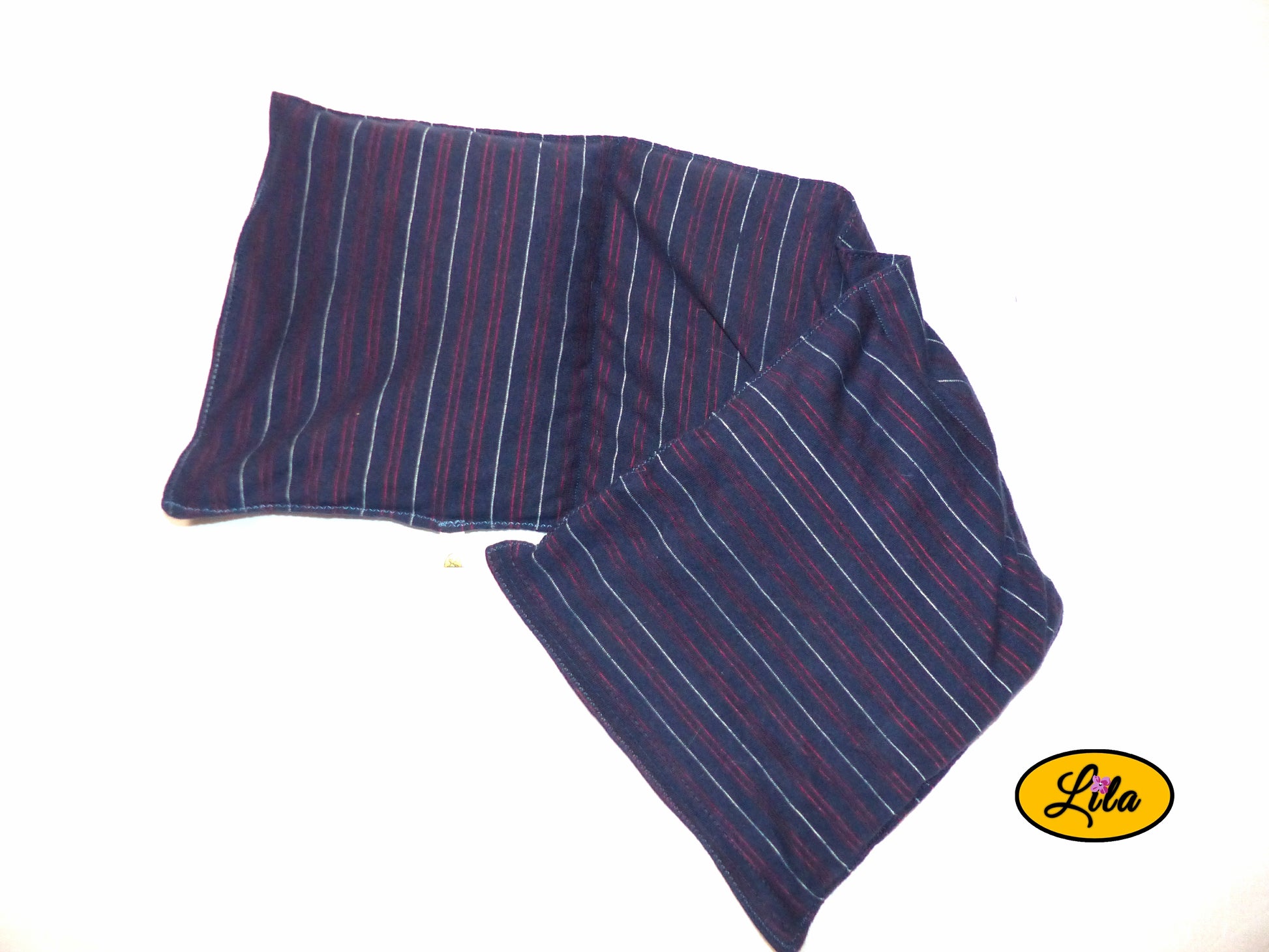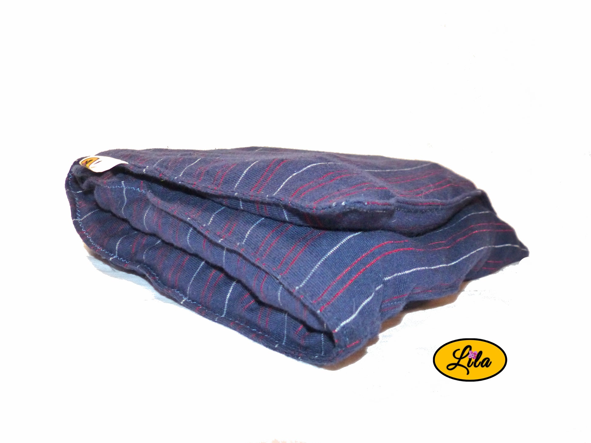 Elle a été réalisée à partir d’un ancien pyjama en coton bleu ligné, soigneusement revalorisé pour lui offrir une seconde vie douce et utile.