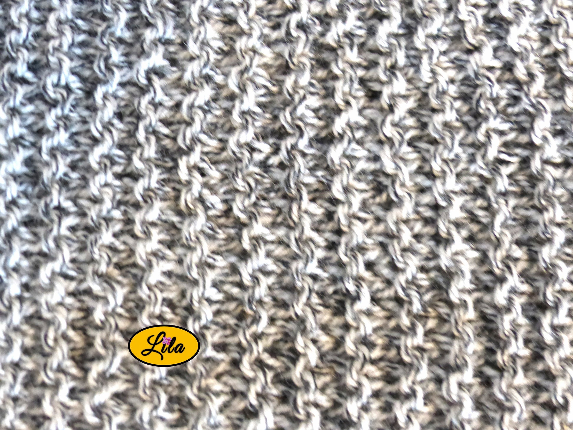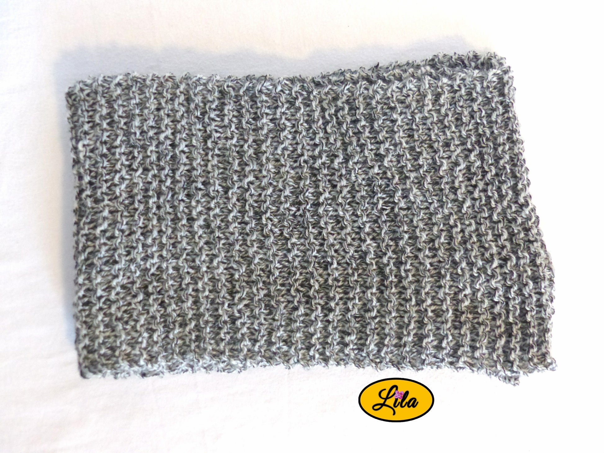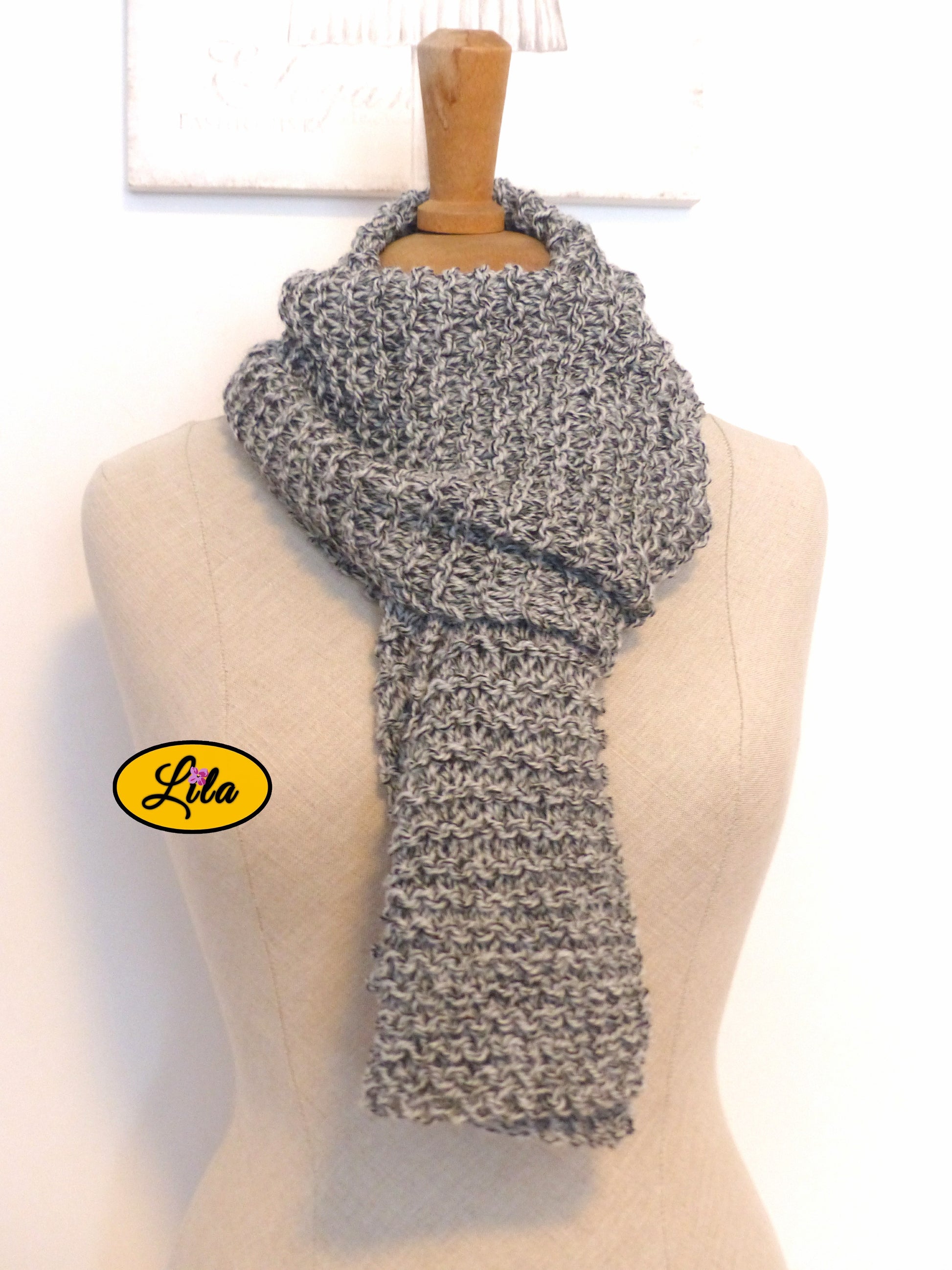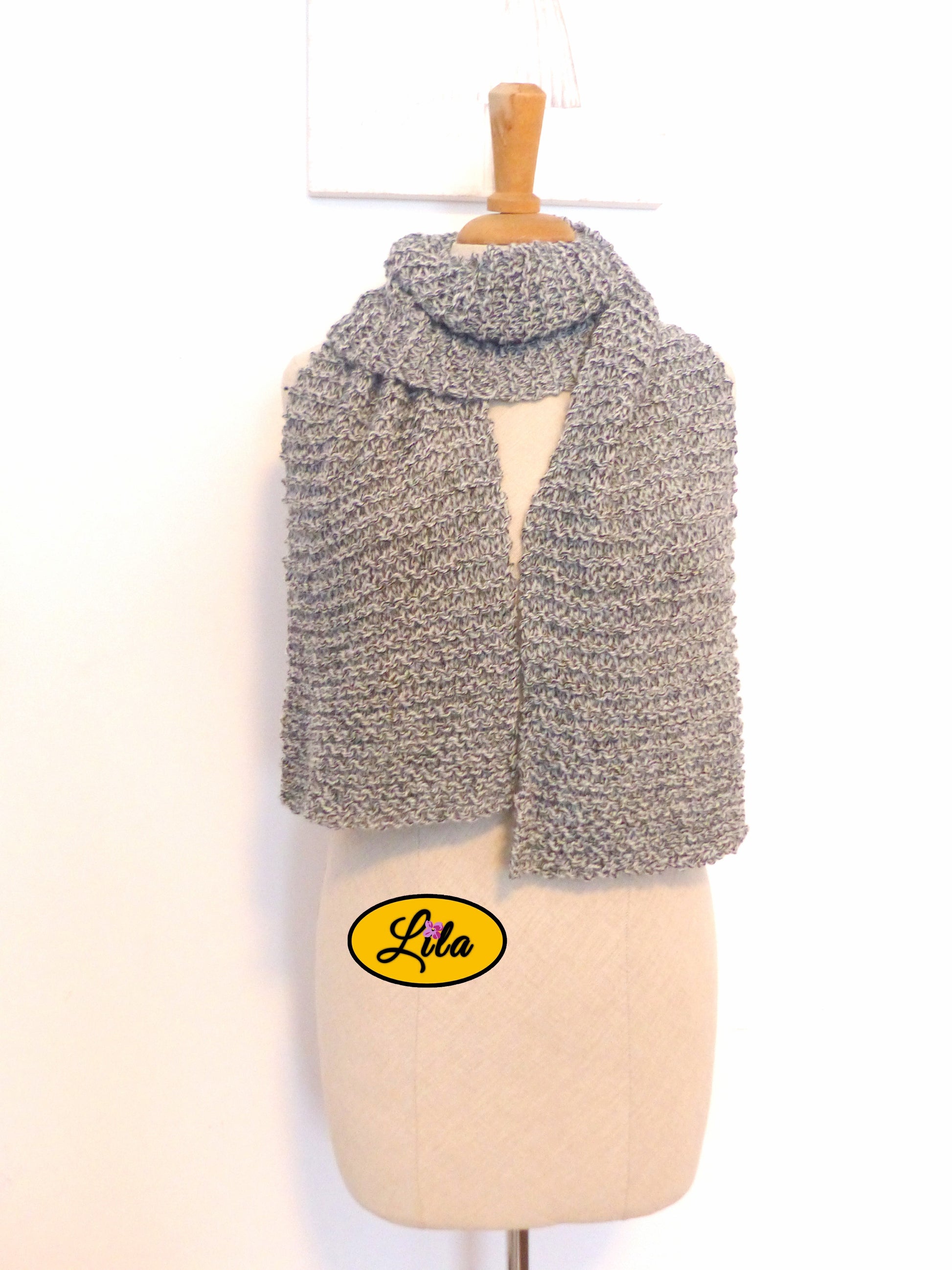 Cette écharpe a été tricotée à la main avec soin dans une laine acrylique aux tons chamarrés de gris, offrant un rendu à la fois doux, texturé et élégant.
