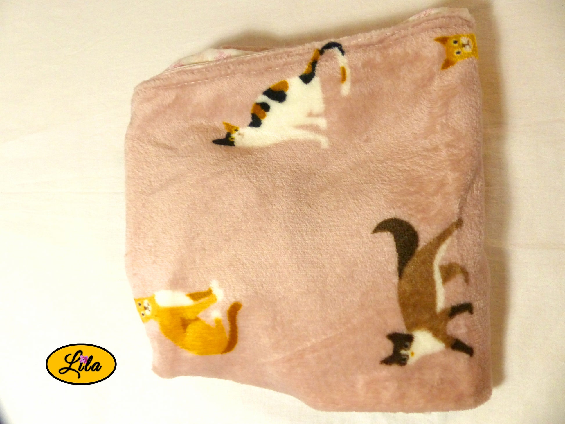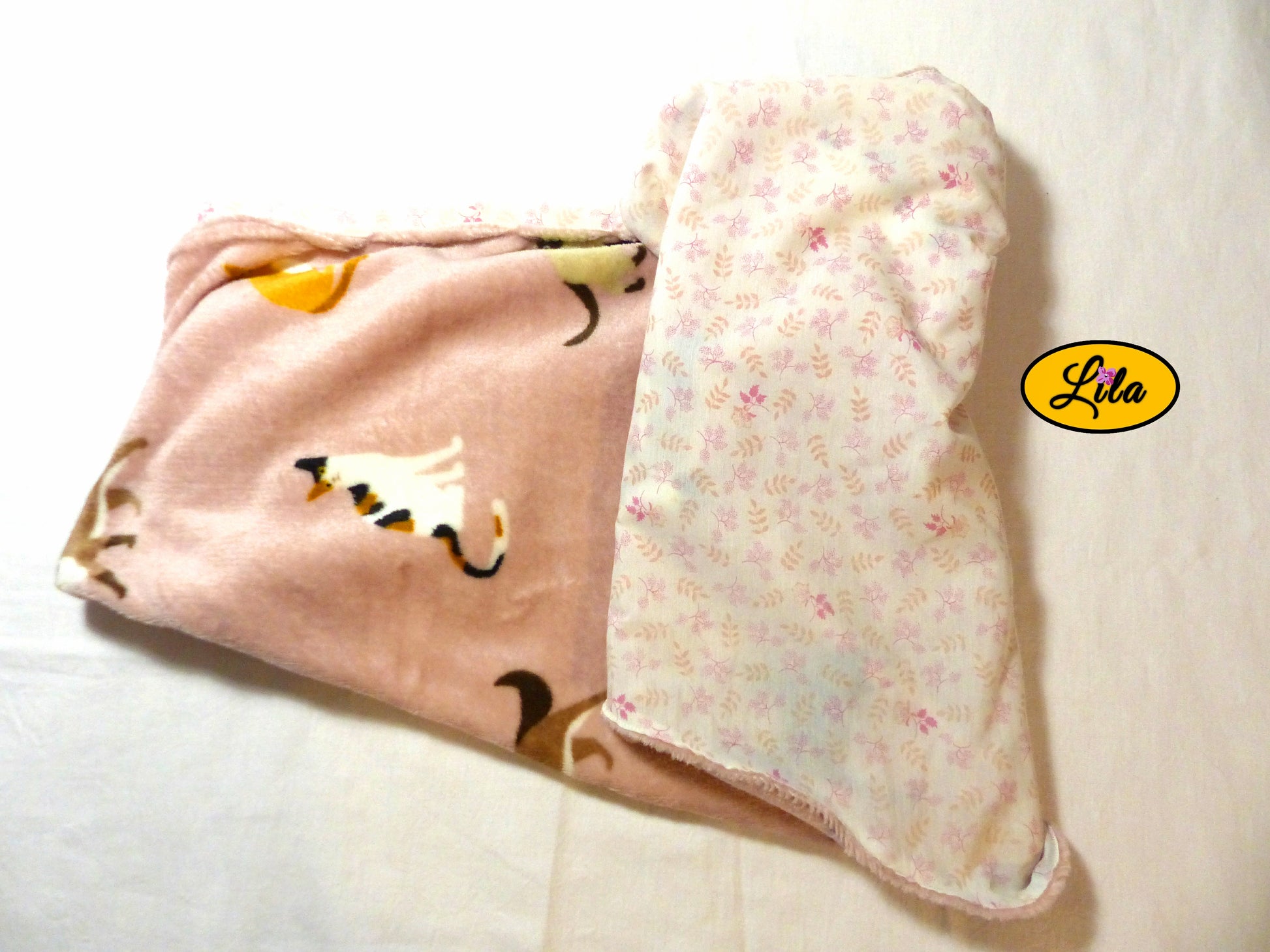 L’extérieur est confectionné à partir d’un drap de lit en coton blanc orné de motifs roses, léger et délicat. L’intérieur, tout doux, provient d’un plaid rose en polaire motif chats, pour une touche amusante et chaleureuse.