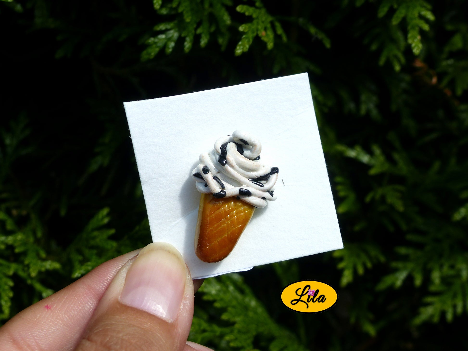 Ce pin’s en forme de glace a été entièrement modelé à la main en pâte polymère, pour un accessoire unique et plein de gourmandise.