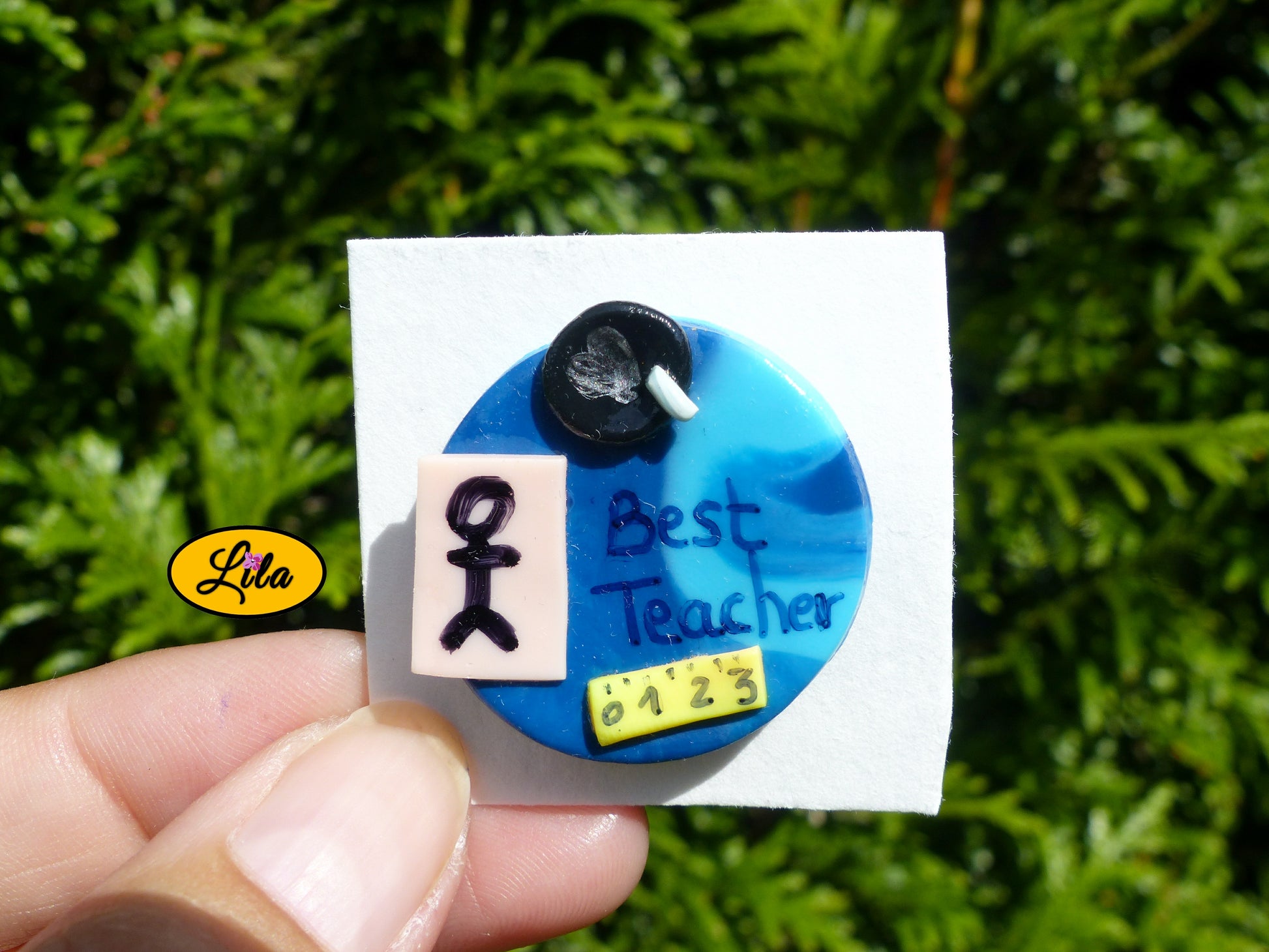 Réalisé à la main en pâte polymère, il se présente sous la forme d’un rond au dégradé de bleu, décoré d’une règle, d’un dessin et d’un tableau noir, avec l’inscription Best Teacher soigneusement écrite au centre.