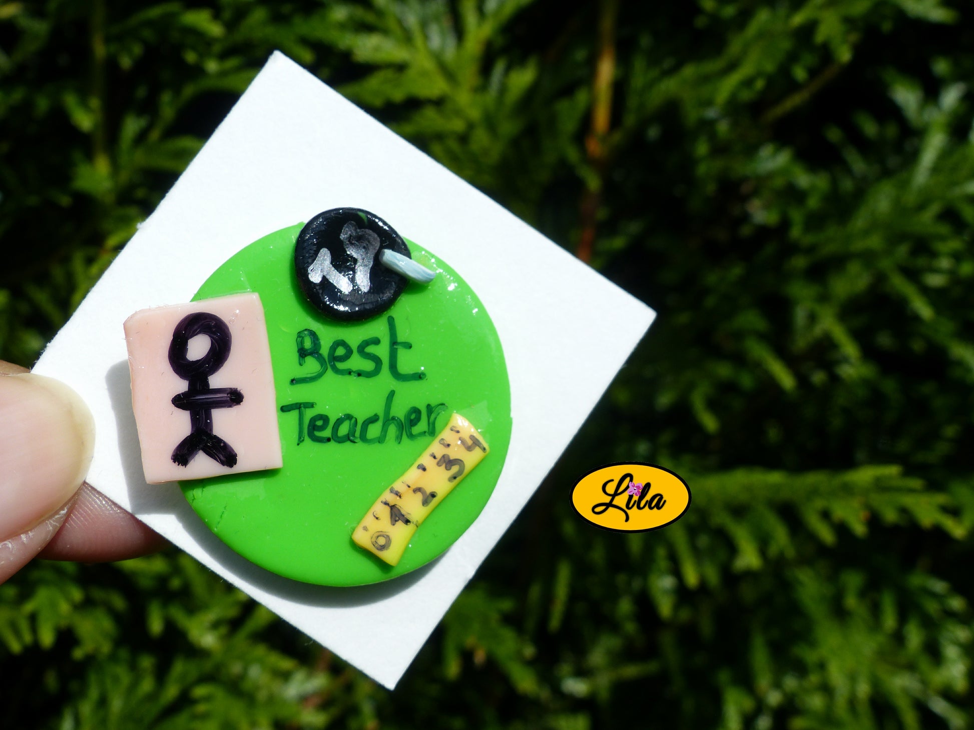 Réalisé à la main en pâte polymère, il se présente sous la forme d’un rond vert, décoré d’une règle, d’un dessin et d’un tableau noir, avec l’inscription Best Teacher soigneusement écrite au centre.