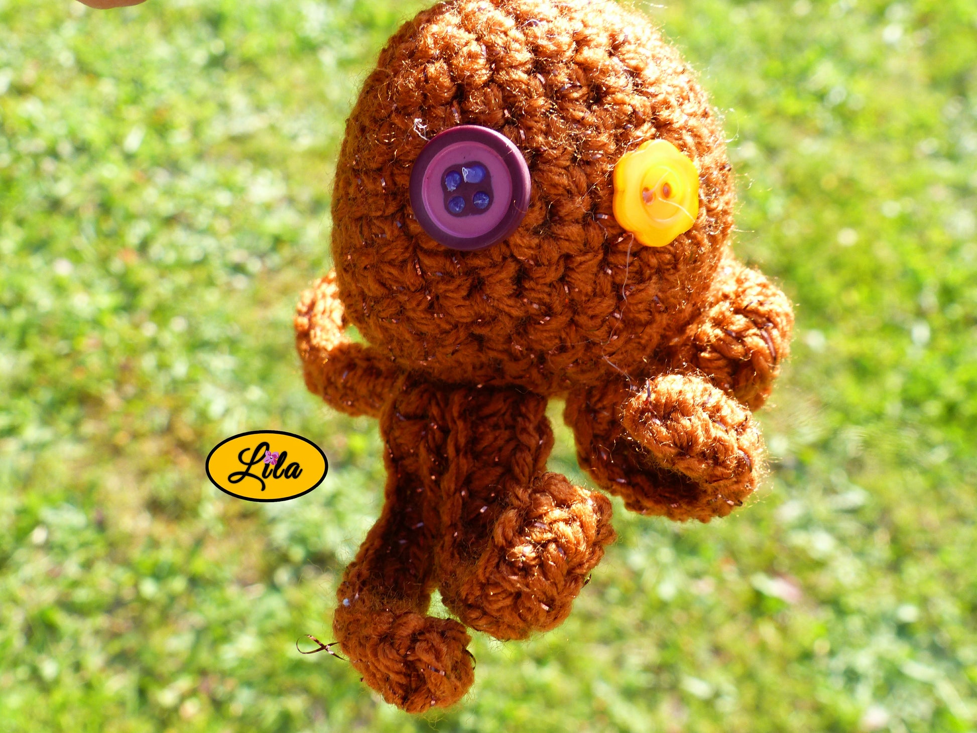 Chaque modèle est entièrement unique : ses yeux sont créés avec deux boutons dépareillés recyclés, lui donnant une expression et une personnalité différentes à chaque fois.