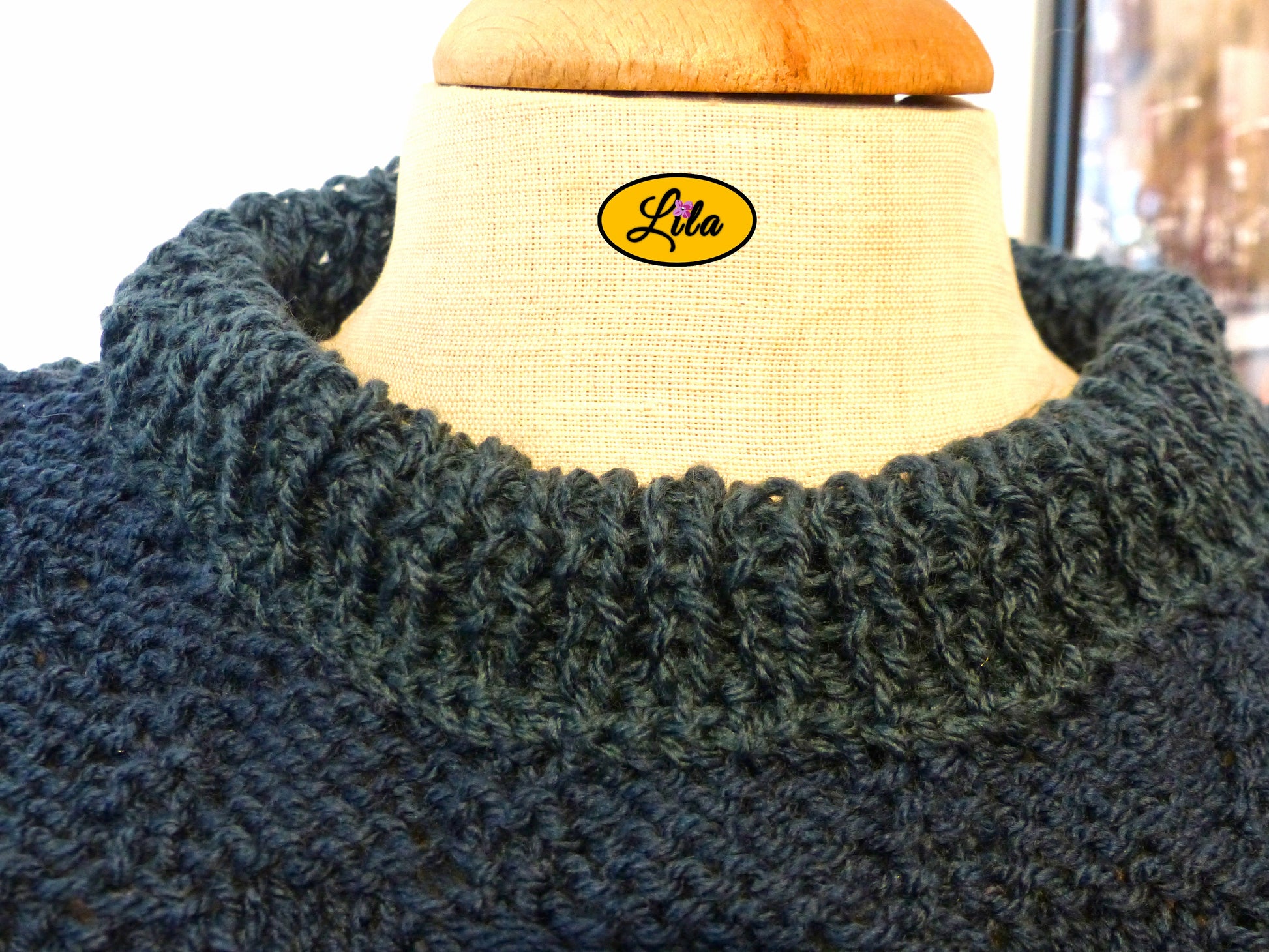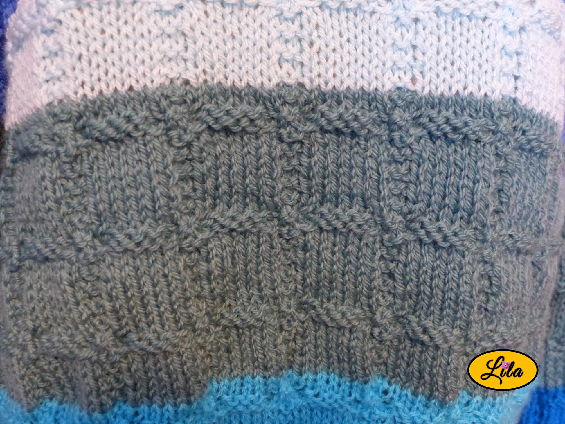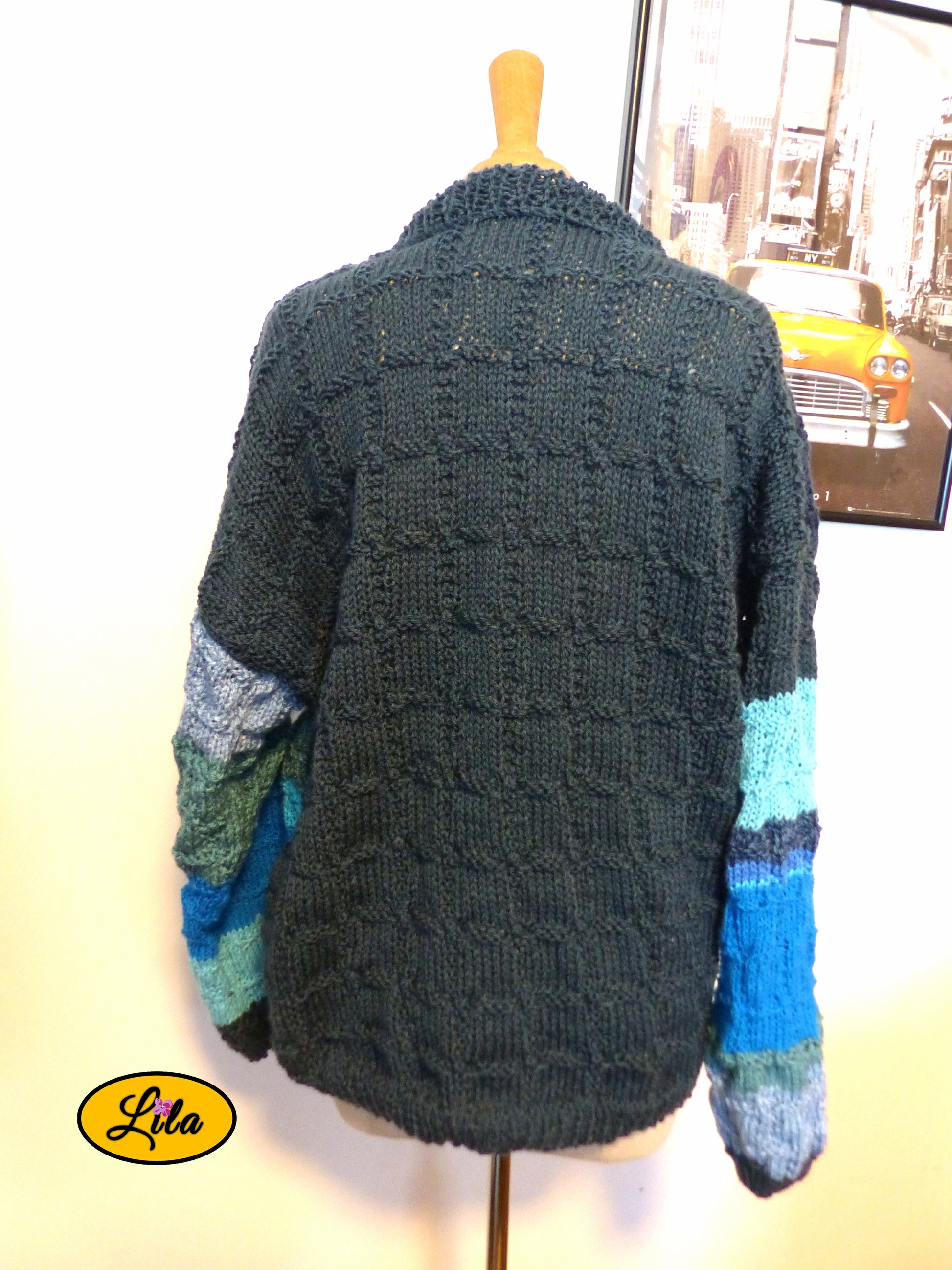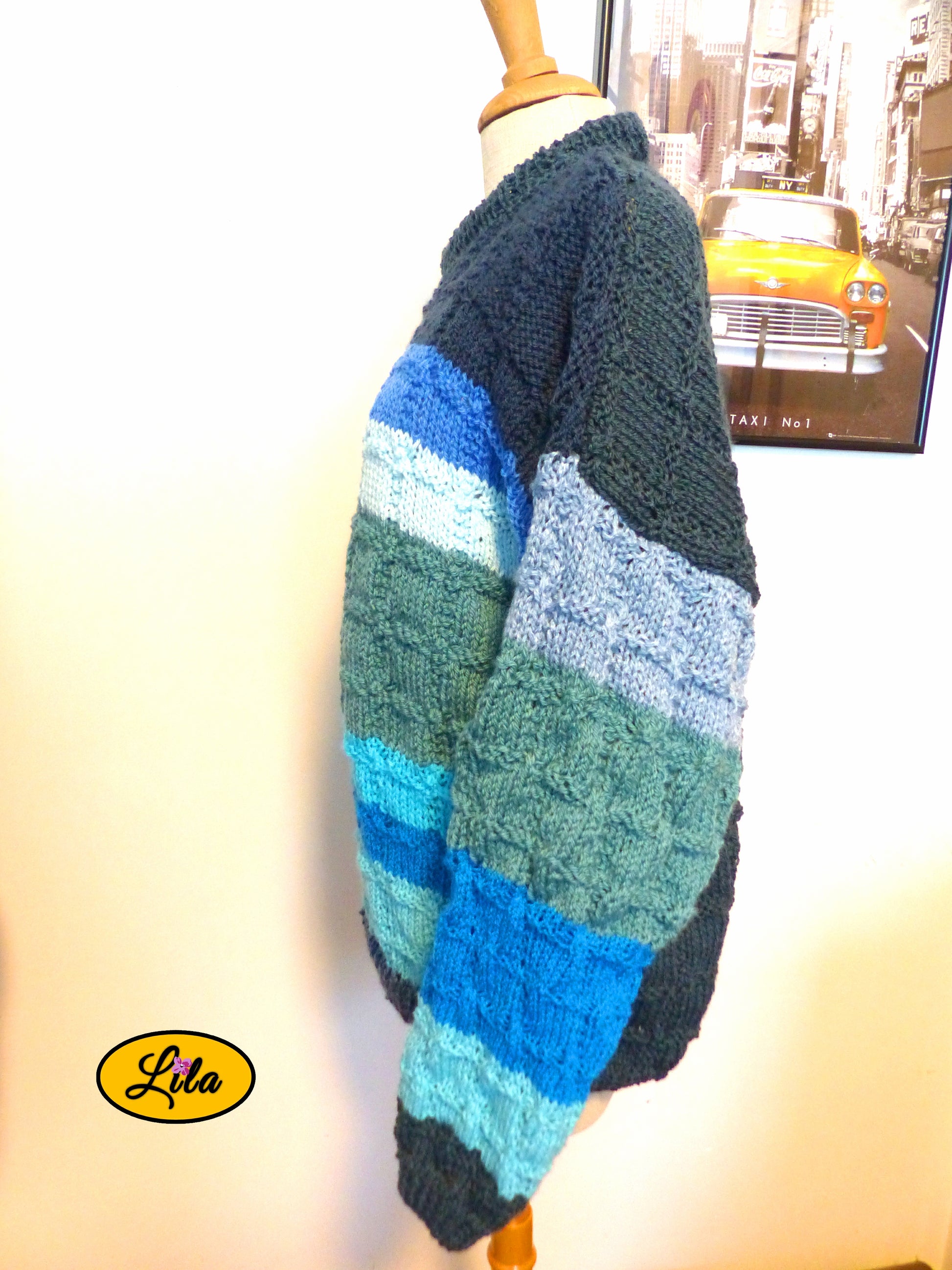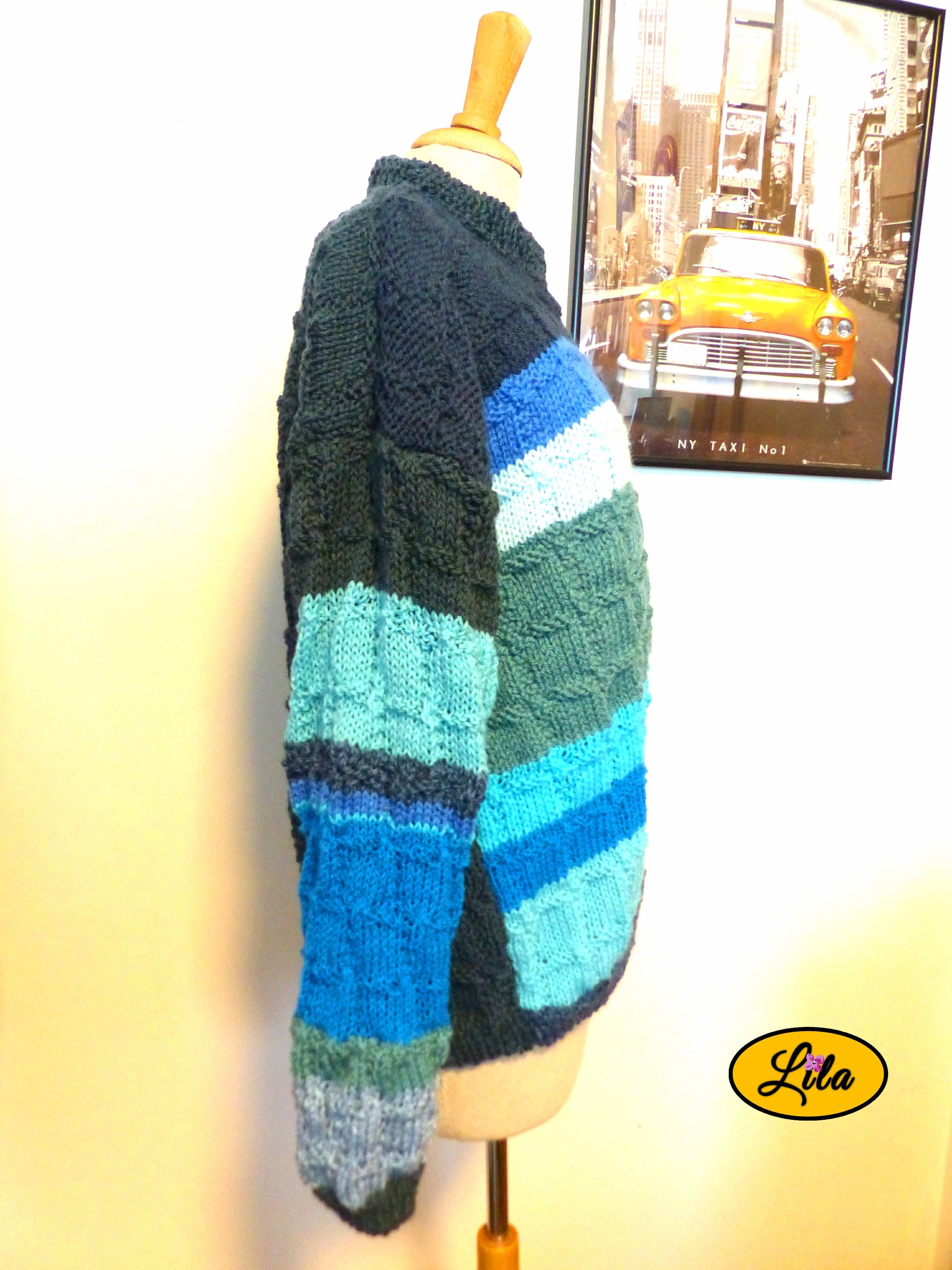 Ce pull Élise a été tricoté à la main à partir de restes de laines acrylique et polyester soigneusement assorties dans une belle harmonie de bleus : turquoise, clair, foncé…