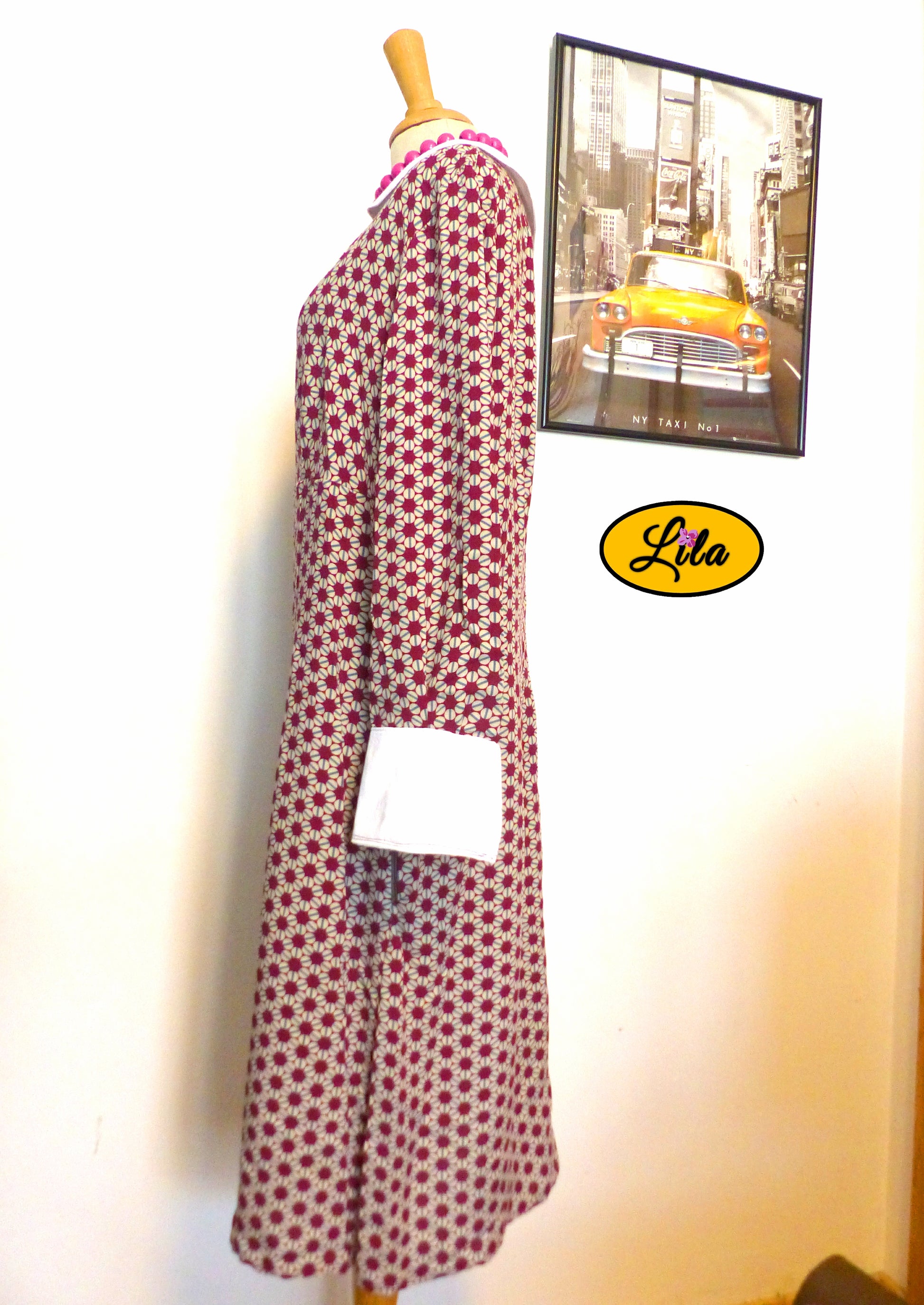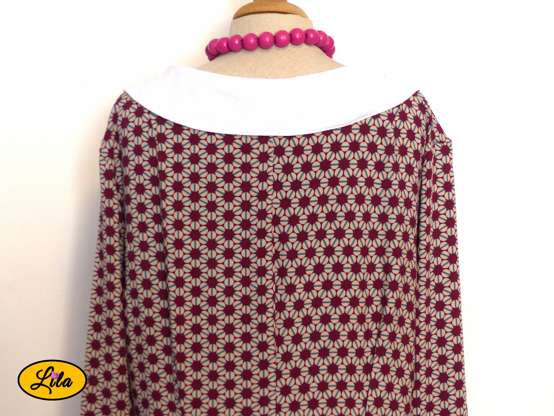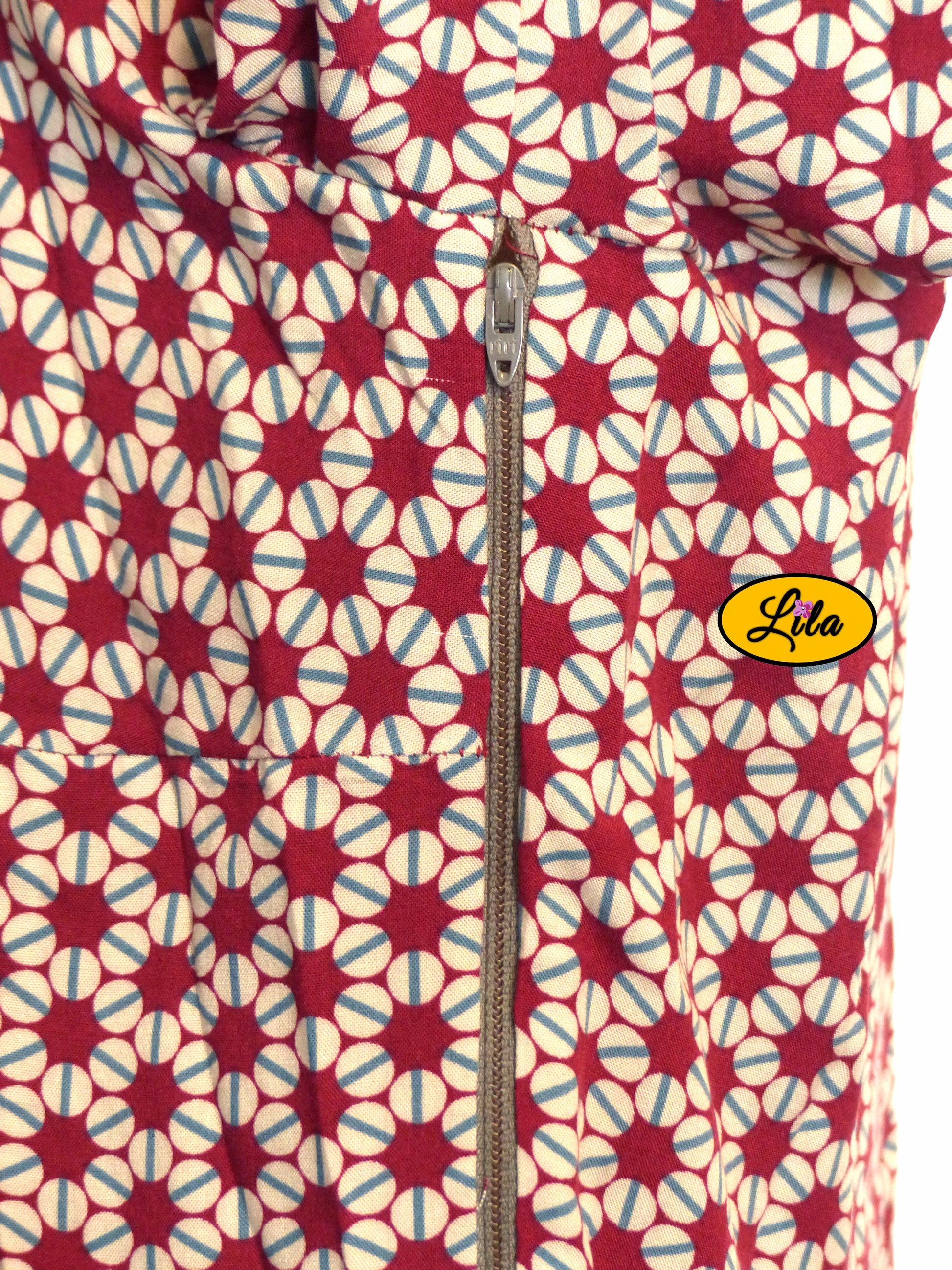 Cette robe unique s’inspire du charme intemporel des années 70, revisitée dans un esprit moderne et responsable. Elle est confectionnée dans une popeline de viscose, souple et fluide, au motif fleuri beige sur fond bordeaux.