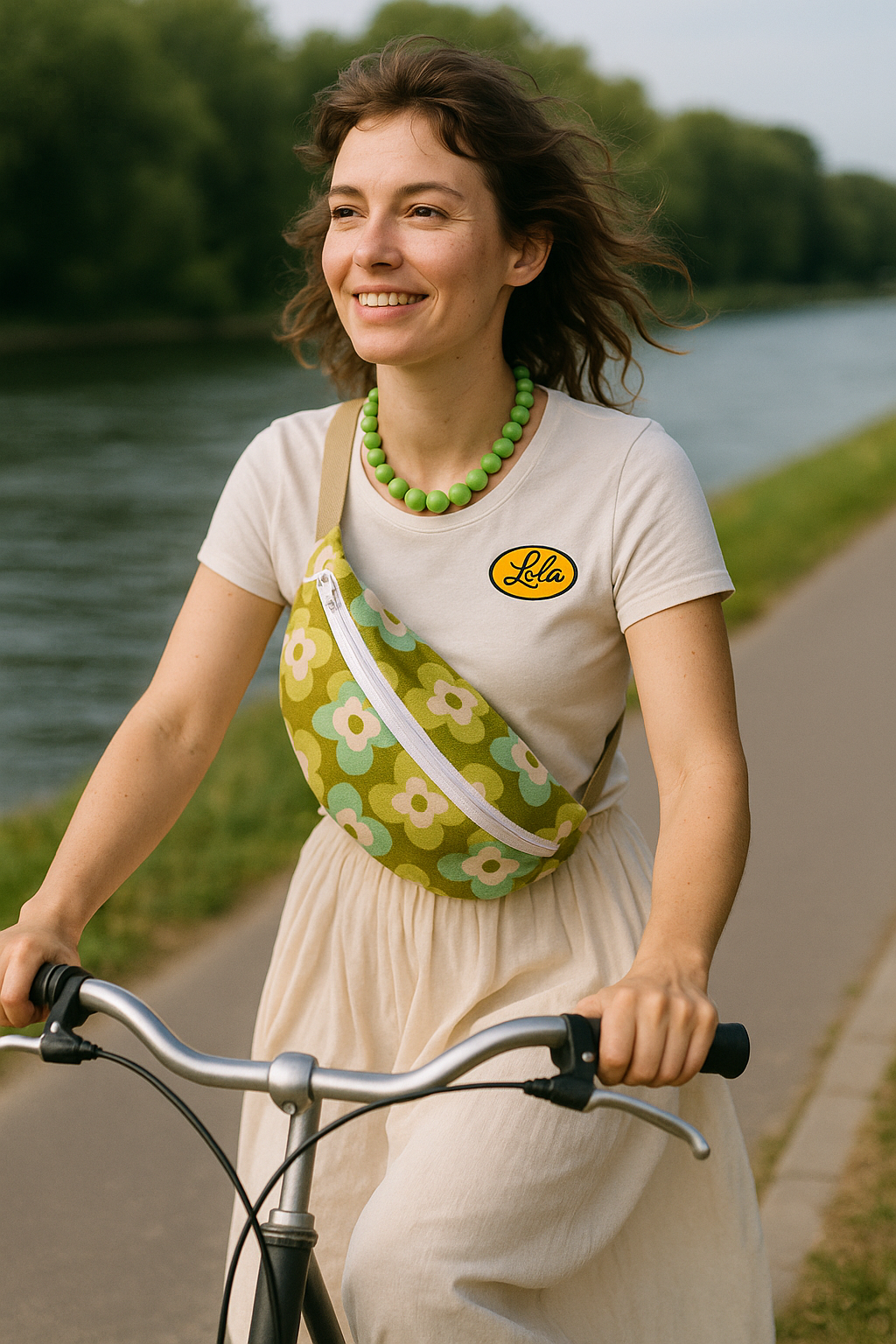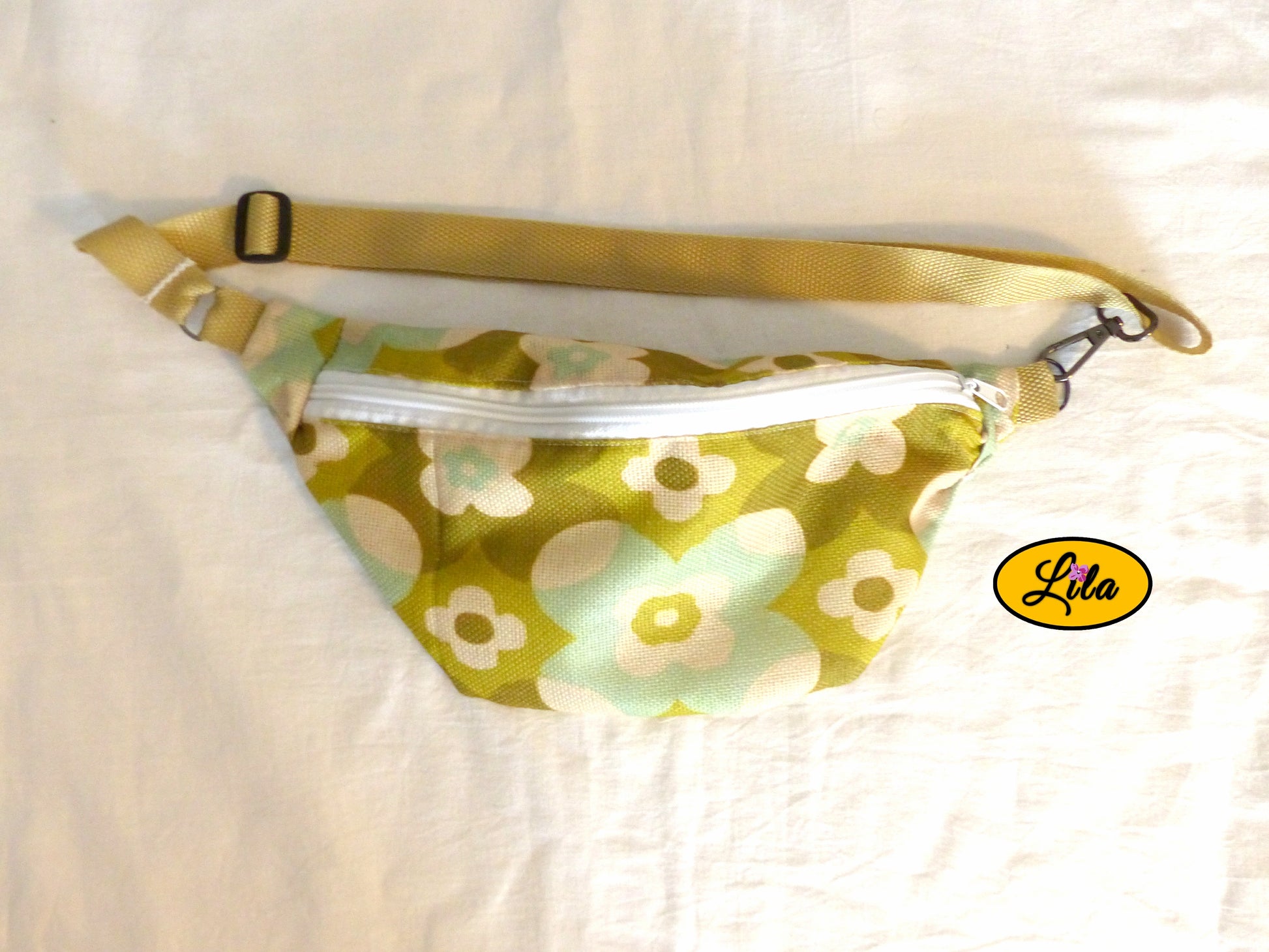 Confectionné à partir d'une nappe fleurie au style vintage, ce sac banane allie fraîcheur rétro et démarche écoresponsable. Son motif floral vert en fait un accessoire joyeux et original, parfait pour égayer une tenue sobre ou compléter un look bohème.