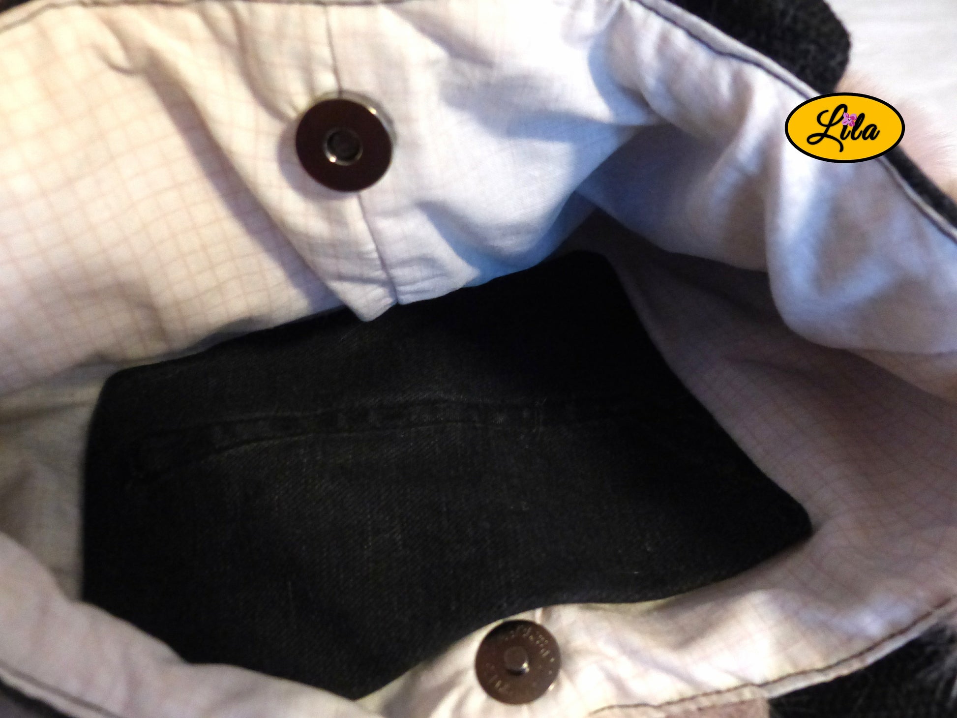 L’intérieur est doublé d’un tissu blanc quadrillé rose, pour une finition propre et lumineuse. Une poche intérieure en jeans apporte une touche pratique tout en rappelant l’extérieur du sac.