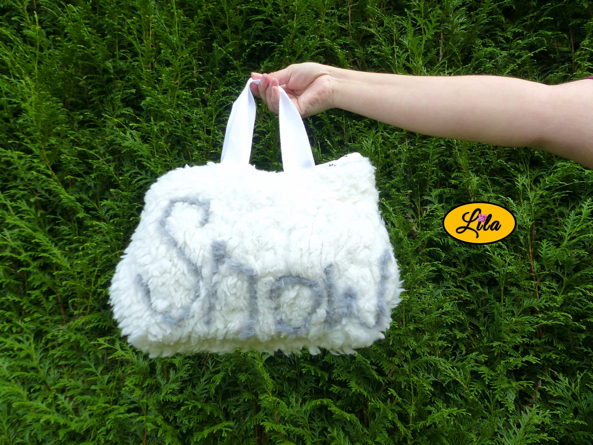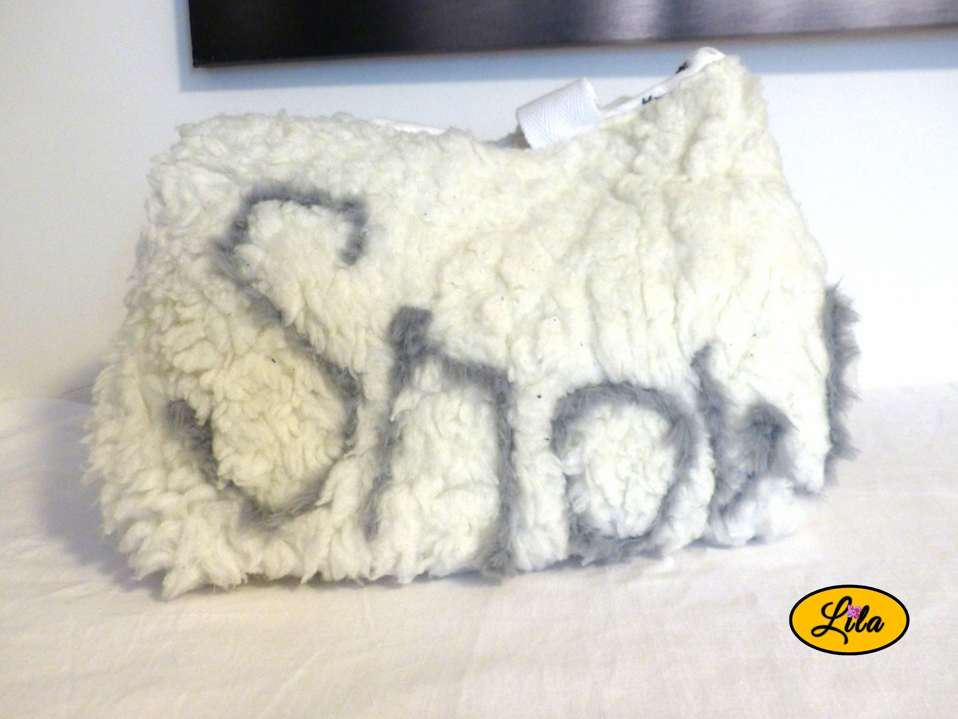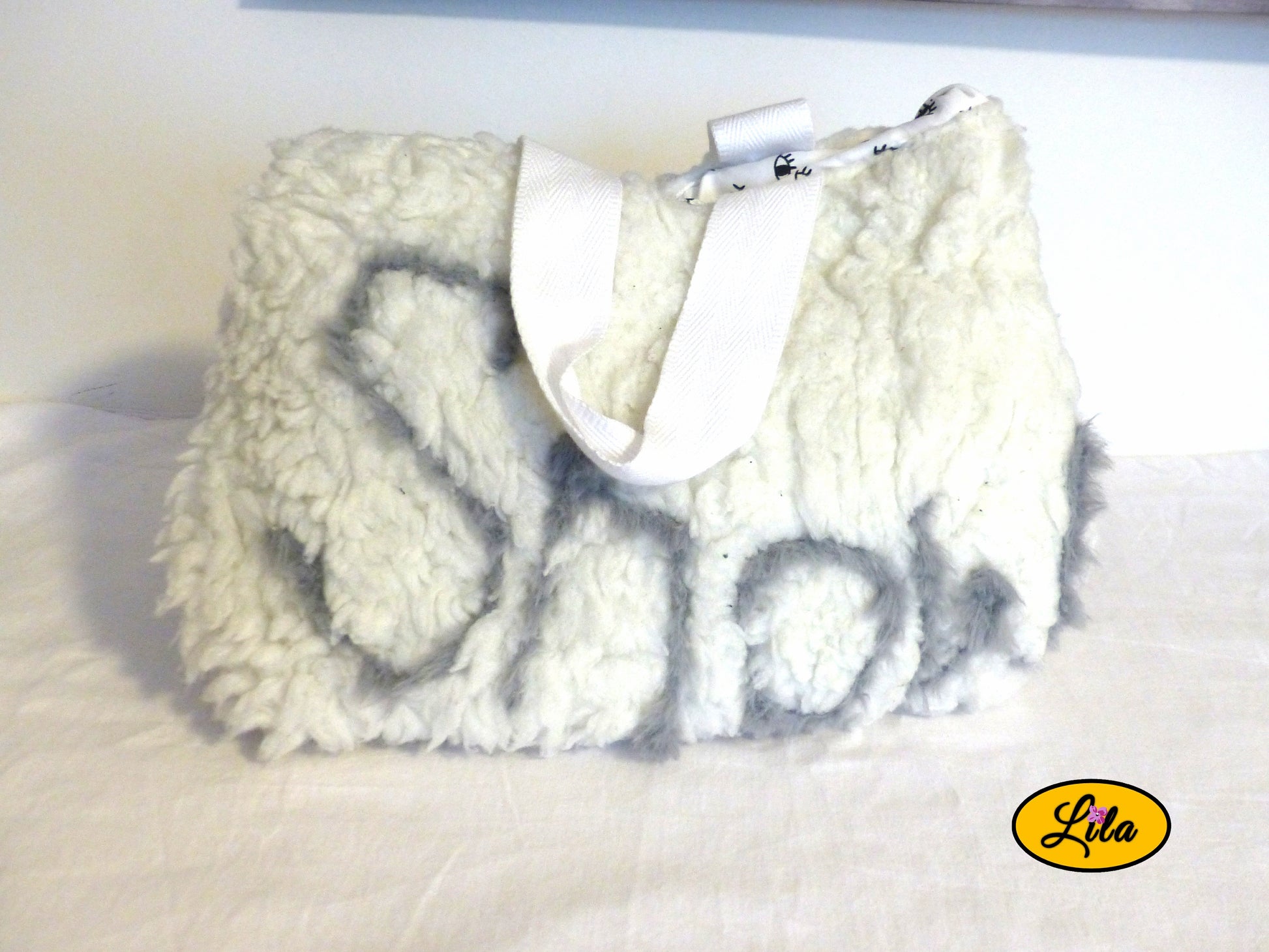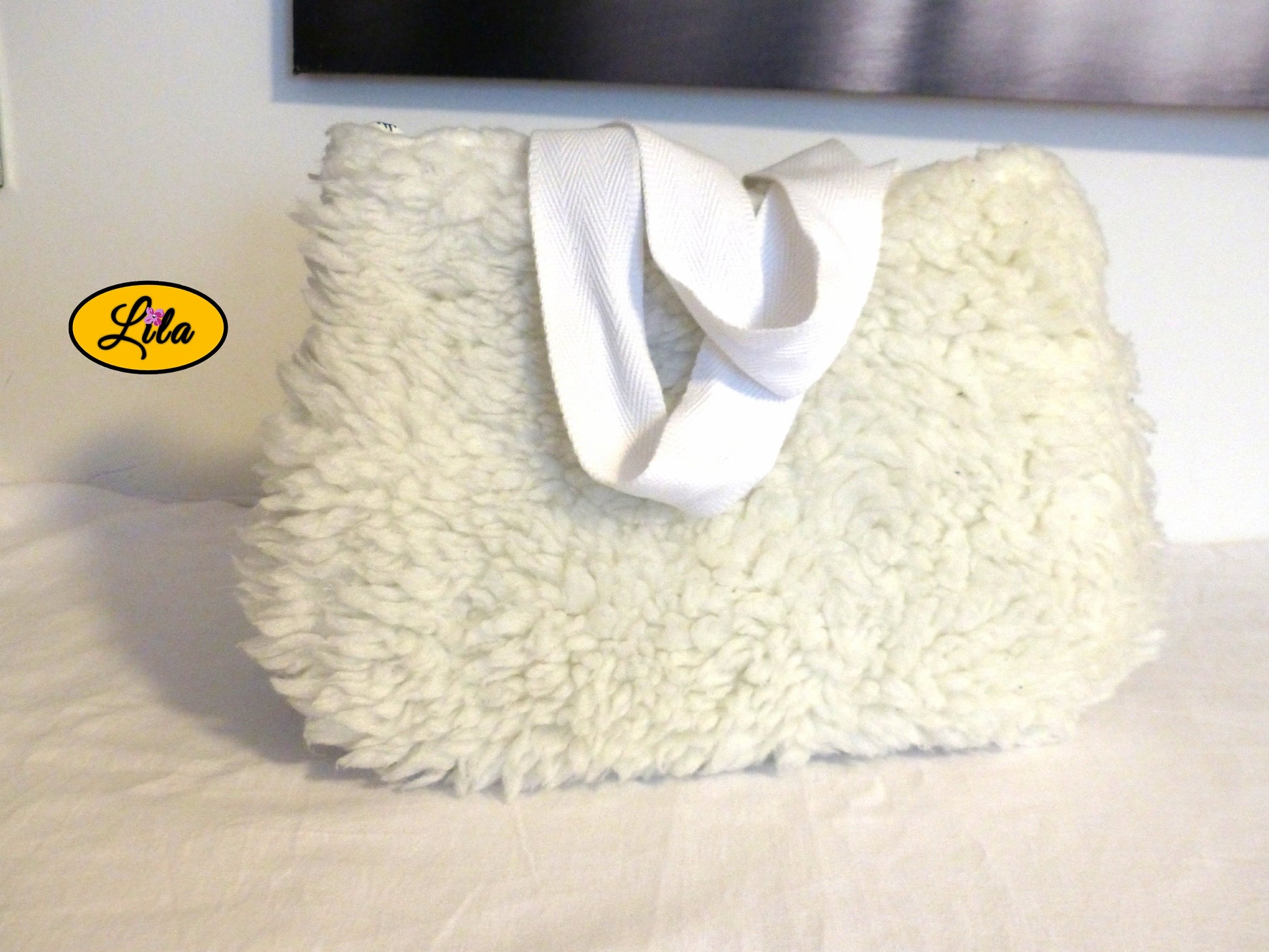 Ce sac tout doux a été confectionné à partir d’une fausse fourrure blanche issue d’un ancien tapis, lui offrant une seconde vie pleine de charme.