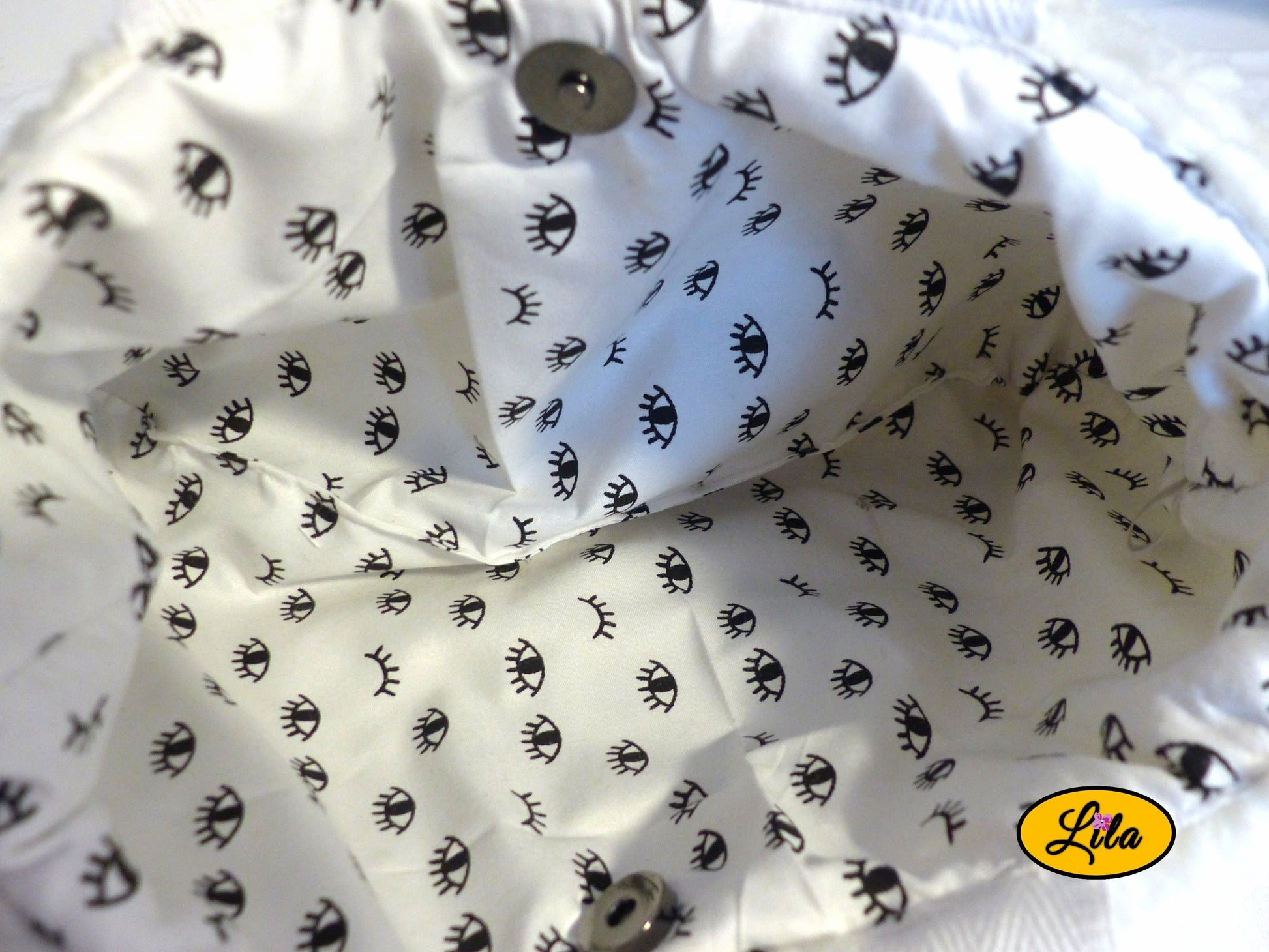 L’intérieur est doublé d’un tissu polyester blanc à motifs yeux noirs, apportant une note fun et moderne. Le sac se ferme grâce à une attache pression, simple et pratique au quotidien.