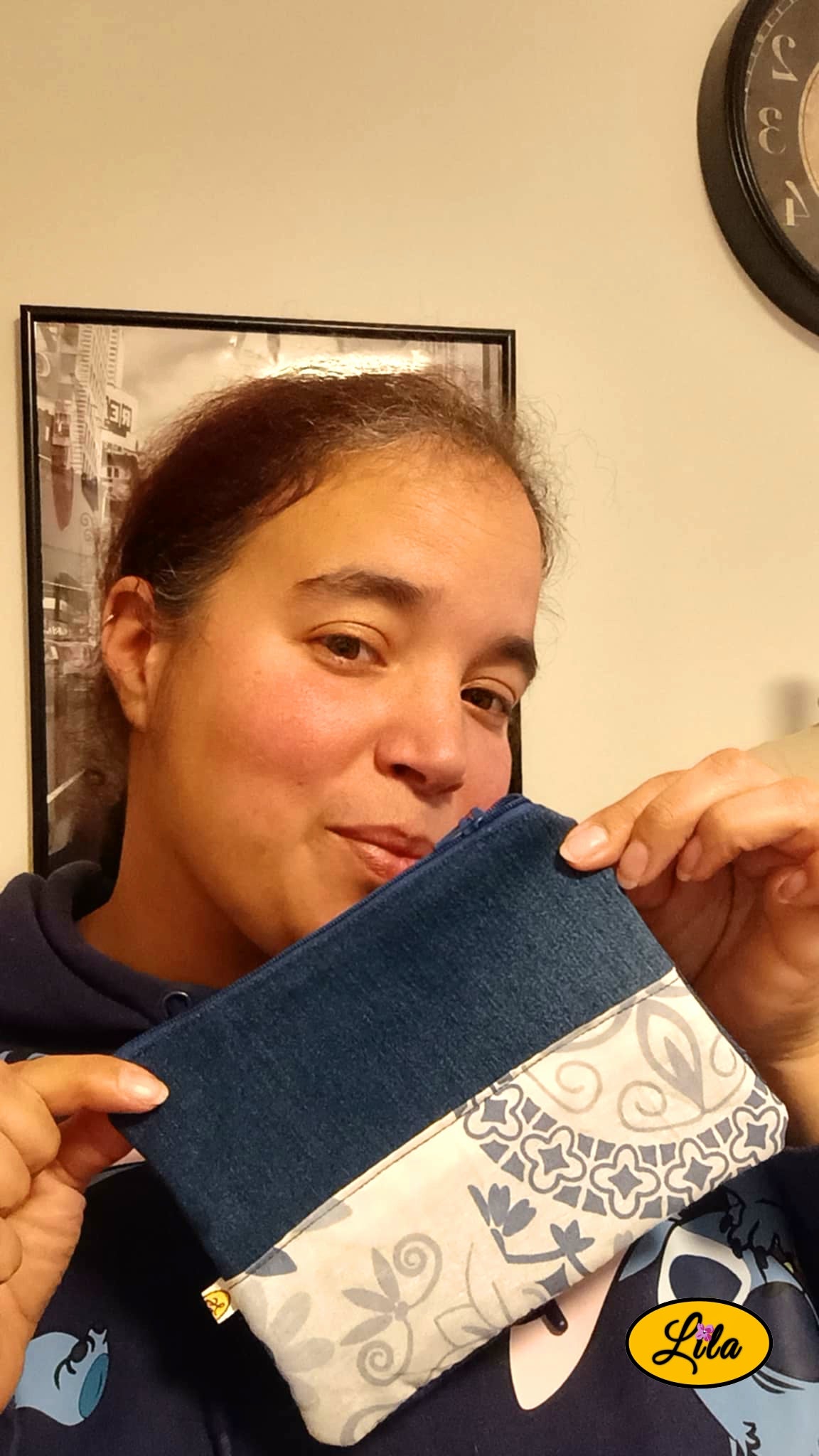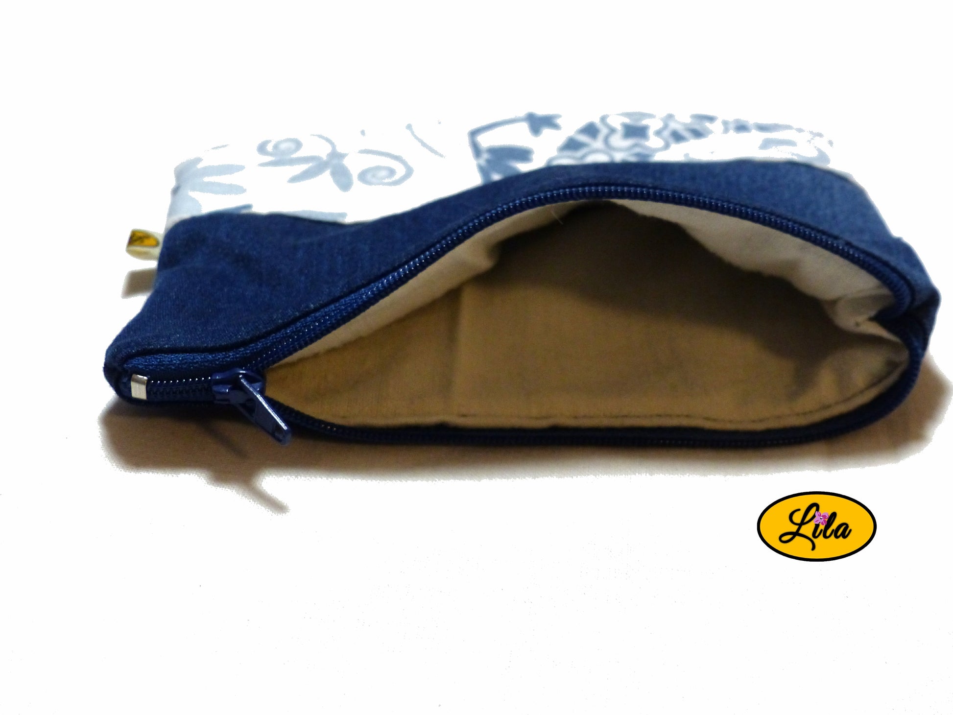 Cette trousse a été réalisée à partir de jeans recyclé, associée à une bande de tissu blanc à motifs bleus qui apporte une touche graphique et originale. Un accessoire pratique, pensé dans une démarche d’upcycling et de création artisanale.
