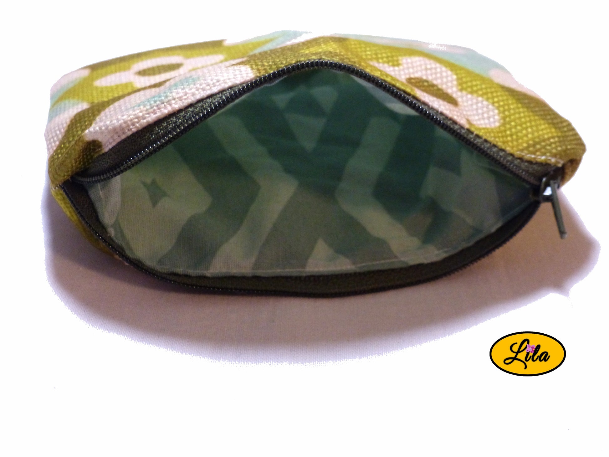 La fermeture éclair kaki s’harmonise parfaitement avec les tons verts de la trousse et assure une ouverture facile et sécurisée.